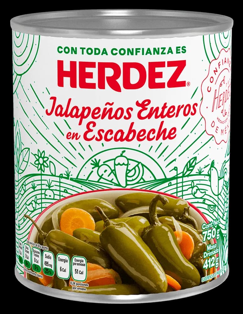 Los tradicionales chiles jalapeños en rajas de HERDEZ® están elaborados con cosechas de alta calidad en sus presentaciones 220g, 380g y 2.8Kg.